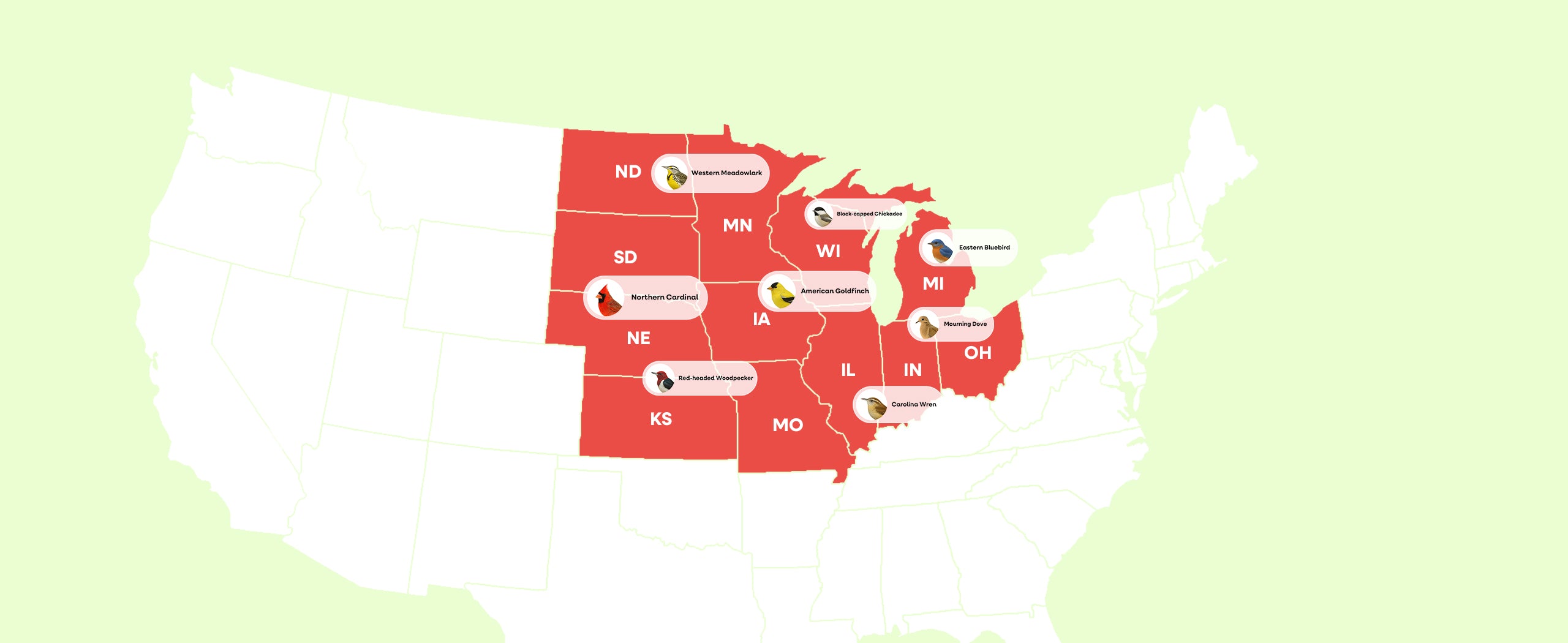 The backyards of the Midwest form a harmonious community of the most classic and easily recognizable American backyard birds, unfolding like a well-loved field guide.